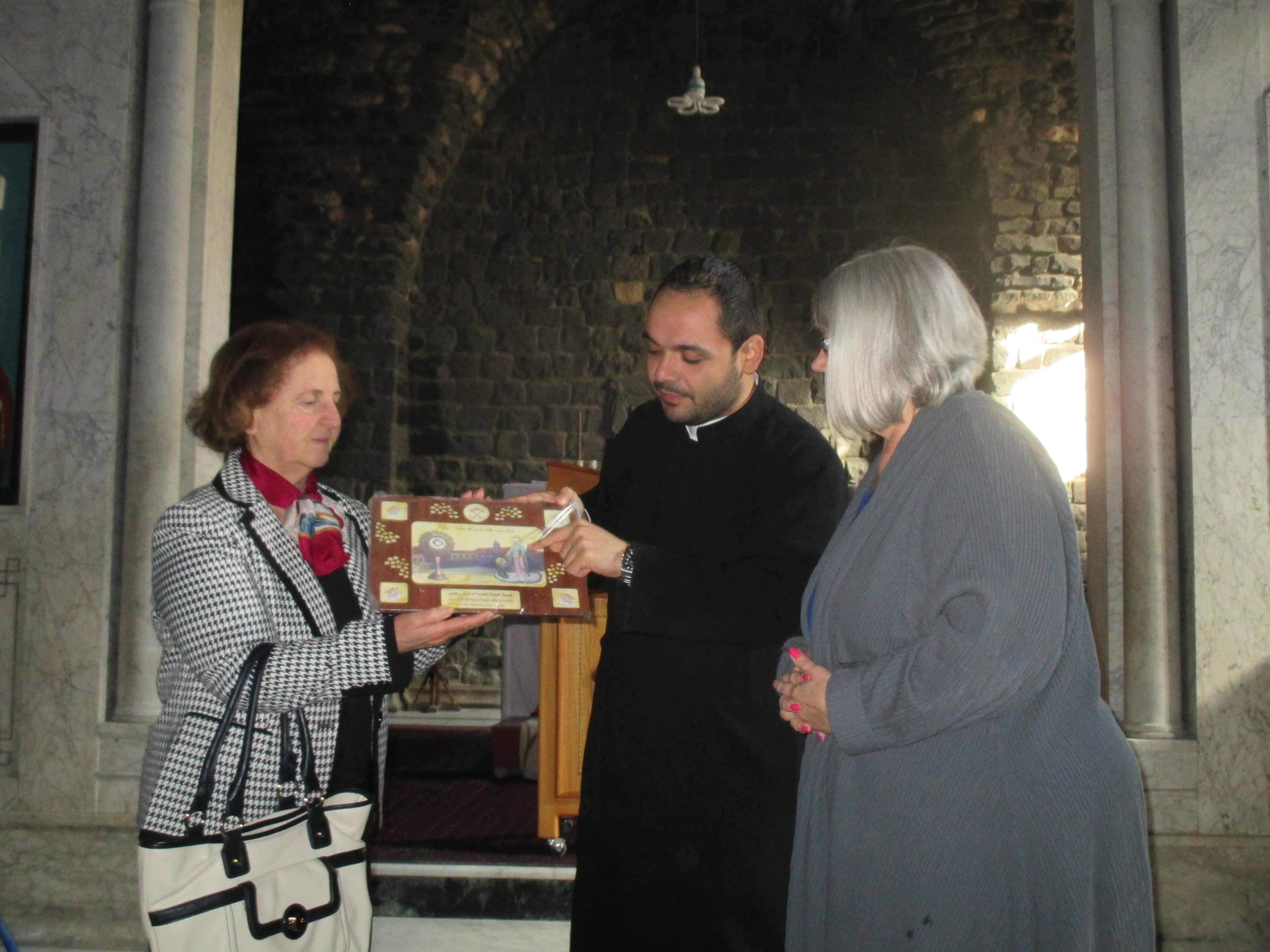 Fr. Ibrahim presents us with the gift of an icon at Notre Dame of the Belt, the Syrian Catholic Church in the old city of Homs, Syria.