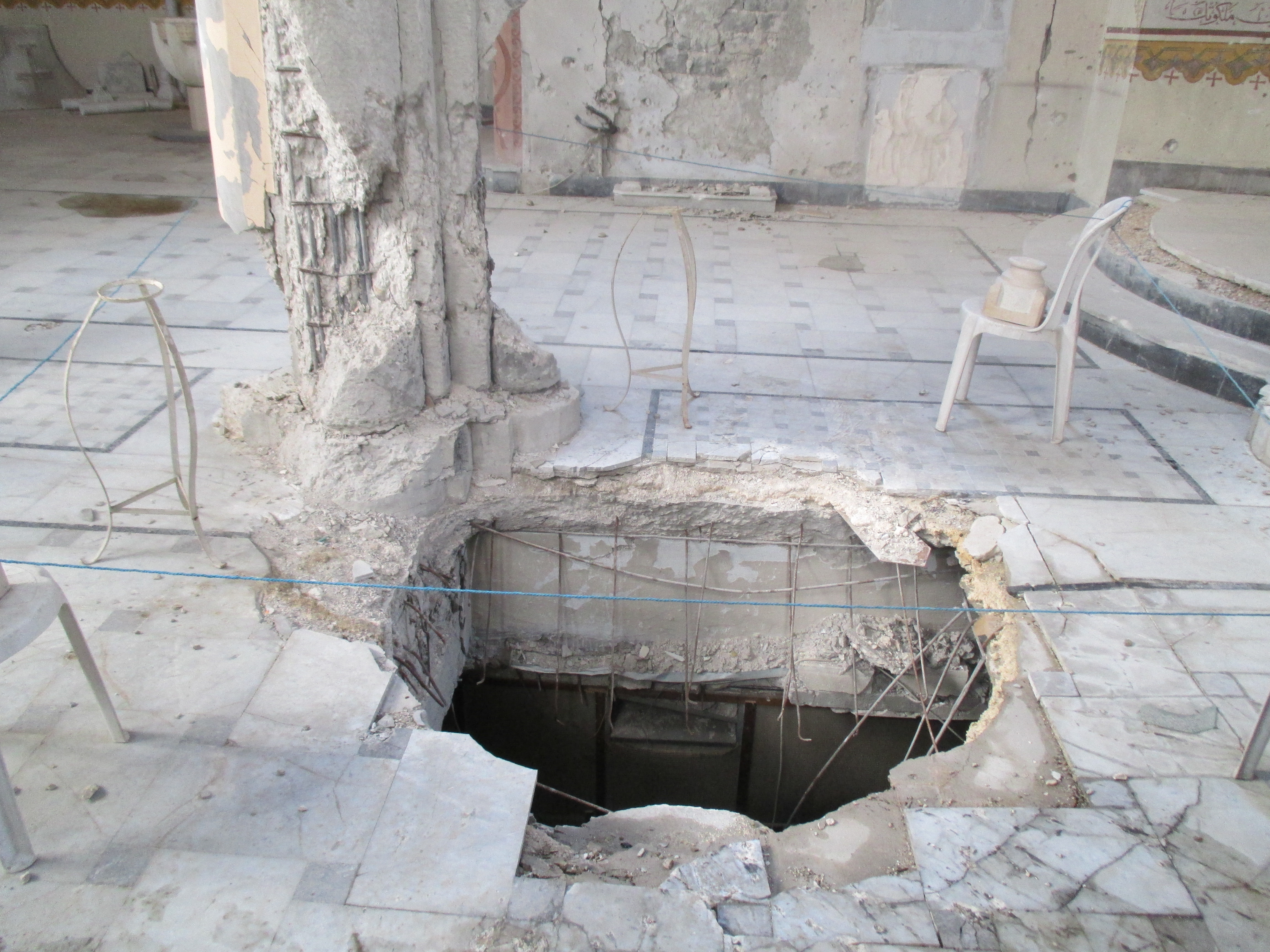 The crater left to the basement of Our Lady of Peace Melkite Catholic Church in Homs, Syria. This is where the pulpit used to be.