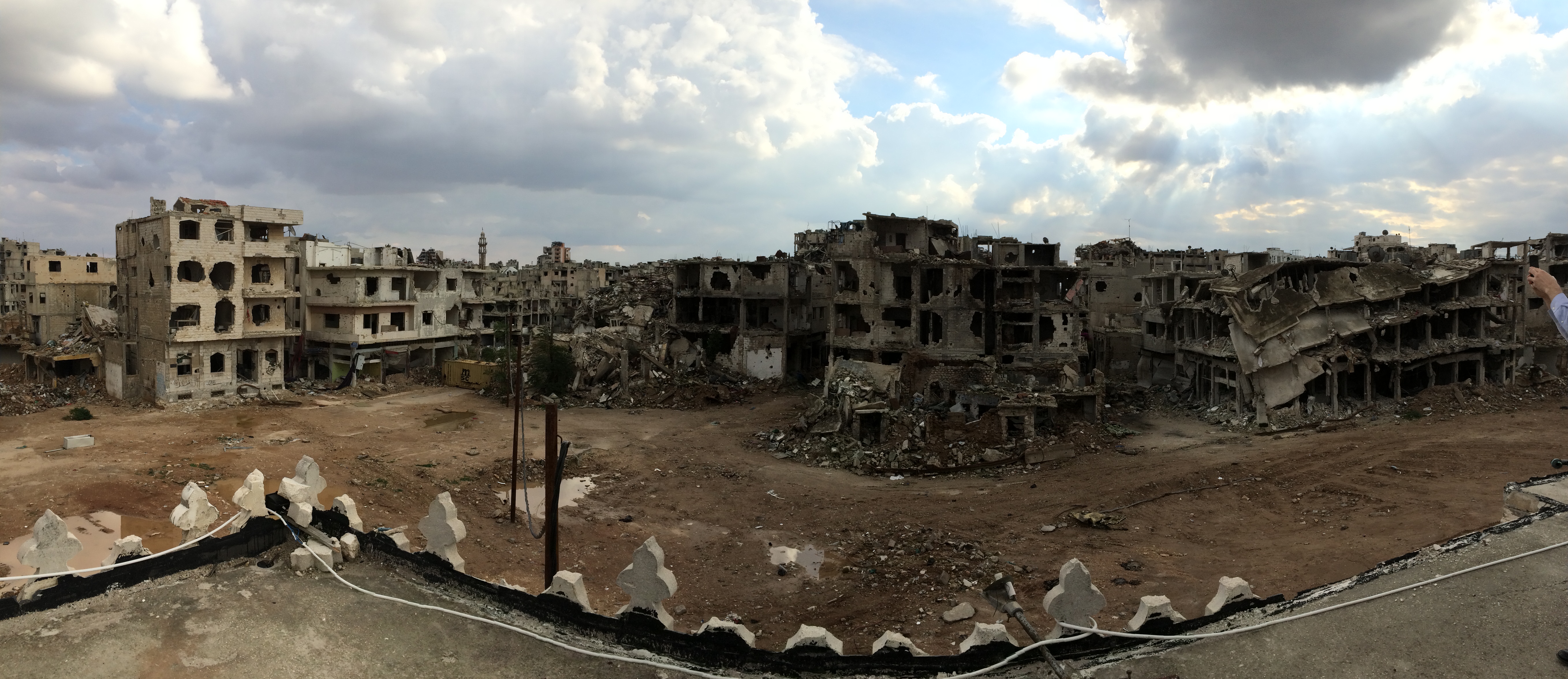 At the Evangelical Church of Homs, the entire youth group sang a hymn of praise for us in the sanctuary, below a cross-shaped hole blown into the roof, standing in puddles of water and mud on the floor. Two mosques on either side of this church were also blown apart. This war was a war on the entire city.