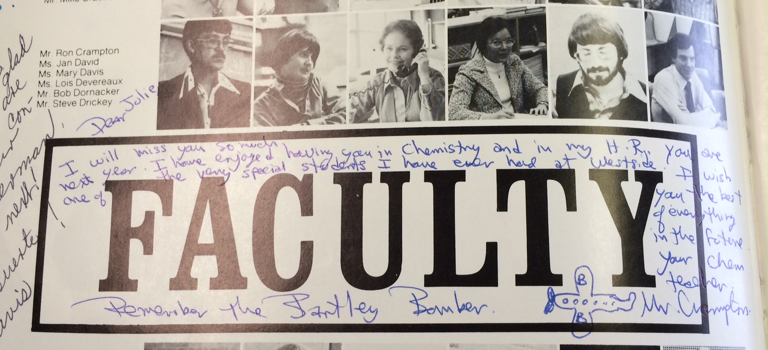 “Dear Julie, I will miss you so much next year. I have enjoyed having you in chemistry and in my H.R. You are one of the very special students I have ever had at Westside. I wish you the best of everything in the future. Your Chem teacher, Mr. Crampton. Remember the Bartley Bomber.”